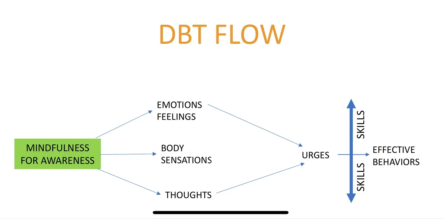 **Special thanks to Susan Mengden, PhD, Founder and Executive Director of Esperanza for Eating Disorders in San Antonio for the DBT Flow above and for her dedication to healing and recovery in Texas using DBT.